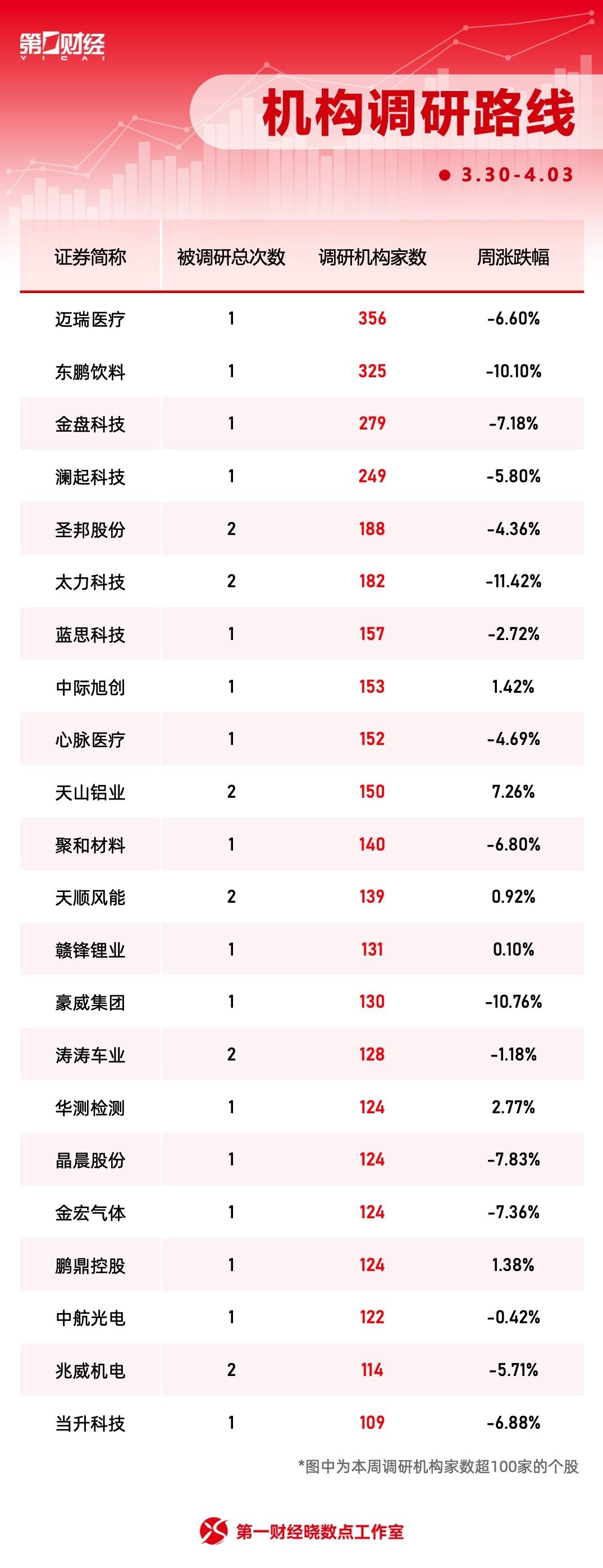 机构本周共调研了355家上市公司 ,其中迈瑞医疗最获关注,参与调研的机构达356家。此外,东鹏饮料获325家机构调研 ,金盘科技 、澜起科技均获超200家机构调研 。